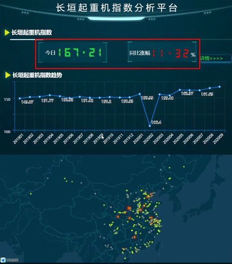 長垣起重機指數(shù)主要依據(jù)《GB/T 3811-2008 起重機設(shè)計規(guī)范》、《GB/T 28264-2017 起重機械安全監(jiān)控管理系統(tǒng)》,借助物聯(lián)網(wǎng)技術(shù),通過機載控制器、傳感器和無線通訊模塊,將起重機的實時工作數(shù)據(jù)回傳到“長垣起重機指數(shù)分析平臺”,利用大數(shù)據(jù)技術(shù),實時分析起重機工作數(shù)據(jù),再對數(shù)據(jù)賦予科學(xué)的權(quán)重比例計算得出,指數(shù)的平均值為150。 隨著我國統(tǒng)籌推進疫情防控和經(jīng)濟社會發(fā)展各項工作,疫情防控形勢持續(xù)向好,復(fù)工復(fù)產(chǎn)加快推進。長垣起重機指數(shù)已從2月份的106.4上升到8月份的167.2,表明疫情之后中國經(jīng)濟復(fù)蘇態(tài)勢明顯,龍門吊逆水行舟動力足!